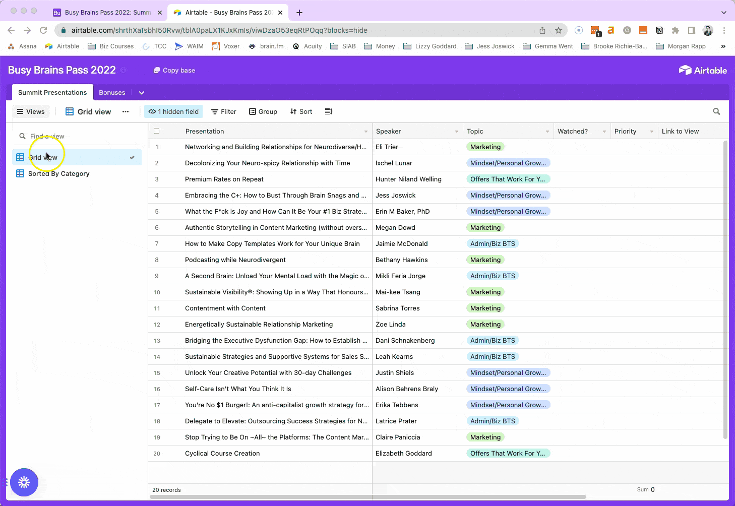So I've created this handy dandy database/spreadsheet to help you prioritize which presentations and bonus resources you'll watch/access, and also keep organized about what you've even got available to you (we all know we've bought courses in the past and totally forgotten they existed!)